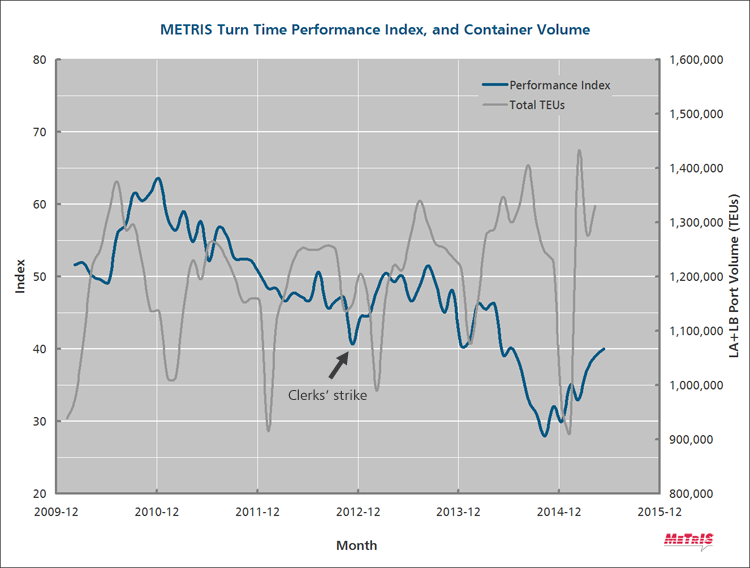 Turn time at LA/LB is on the mend. It has certainly bounced back from November 2014 when it bottomed out at 28 on the METRIS 0-100 Index. In June 2015 it stood at an 11-month high of 40.