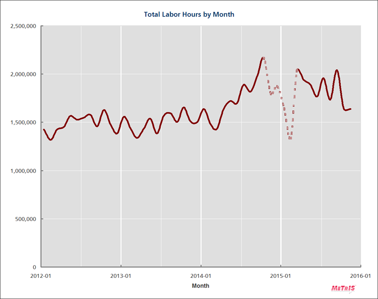 First let's look at labor hours over the past 4 years (Figure 1). In 2012 and 2013 they were in the range of 1.5 million hours each month. In 2014 they climbed sharply to a peak of 2.2m, a 50% increase. They've retreated a little, to the 1.8m range now. (This deliberately ignores the period of intense volatility in the thick of the 2014-2015 labor slowdown.) Bottom line: there's been 20% more labor deployed through most of 2015 than in 2013. Might this be due to container volume?