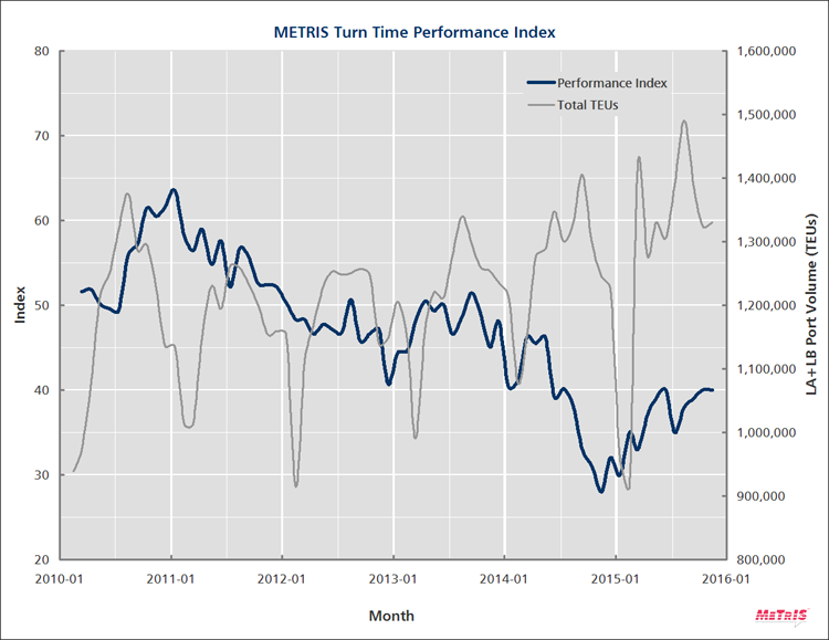 Back in July, I characterized turn time at LA/LB as being in the doldrums, rating a D– at best, with the trend lacking a promising prospect of improvement. The METRIS Turn Time Performance Index (TTPI), cast on a scale of 0-100, seemed unable to punch through 40. In the following months it dropped again, and has now returned to 40 for two months straight. The term “doldrums,” it turns out, was apt.