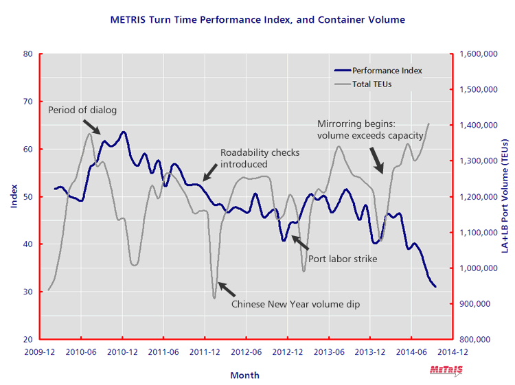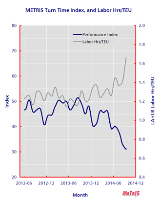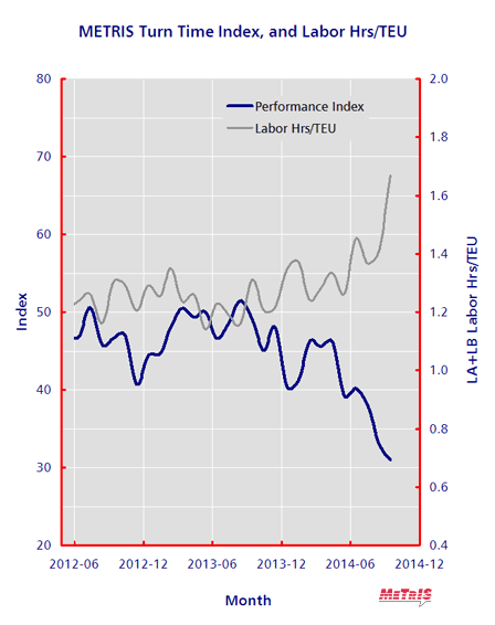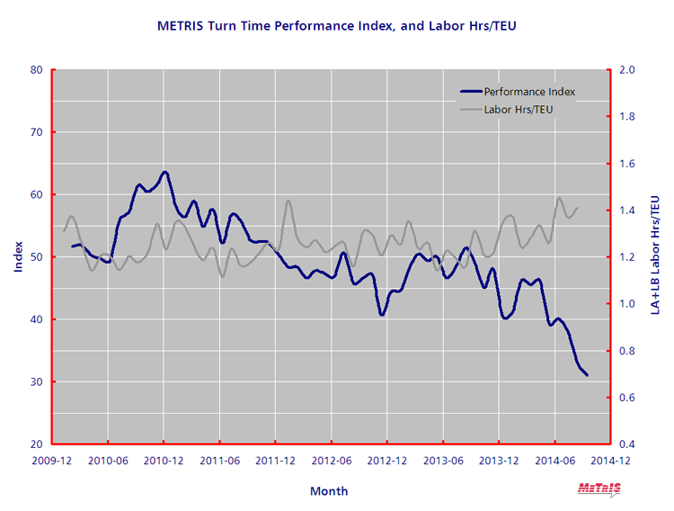 Truck turn time in Los Angeles-Long Beach hit another record in October, with 36% of all trips over 2 hours, and a new low of 31 on the 100-point METRIS Performance Index. In 2010 the time a trucker needed to budget for a trip to meet a deadline was 2-3 hours. This past July it was 3-4 hours. In October it was 4-4½ hours.