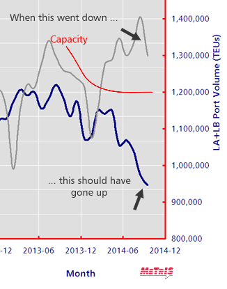 Figure 1. The mirror image that develops between the two curves starting in spring 2014 suggests that the ports are currently operating with a diminished capacity of around 1.2 m TEUs/mo, beyond which volume is directly reflected in poorer truck turn time performance. Prior to 2014 that was not the case because there was copious surplus capacity. Mouseover/click the figure to see the drop in capacity.